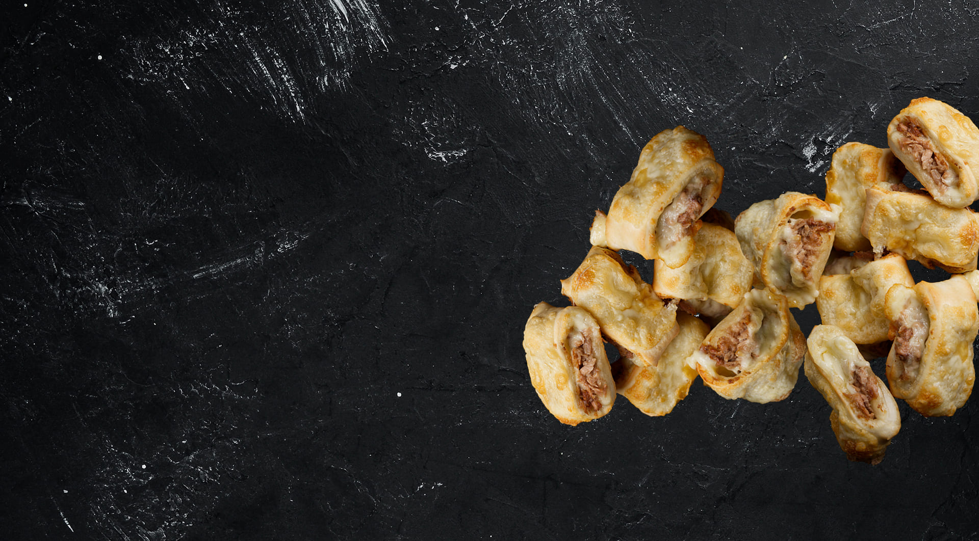 Frischer Teig, Gouda-Käse, Thunfisch.