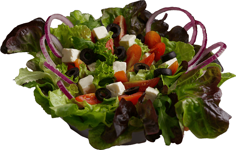 Gemischter Salat, Cherrytomaten, Rucola, Hirtenkäse, Oliven, rote Zwiebeln.