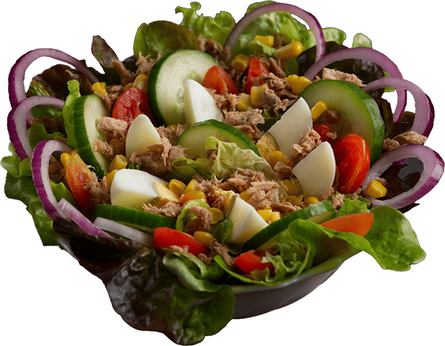 Gemischter Salat, Cherrytomaten, Gurken, Mais, Thunfisch, rote Zwiebeln, Ei.