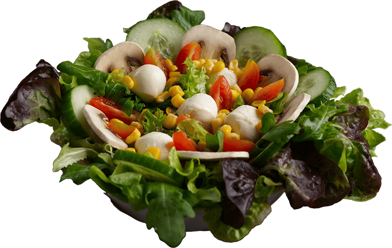Gemischter Salat, Cherrytomaten, Gurken, Rucola, Mozzarella, Mais, Champignons.