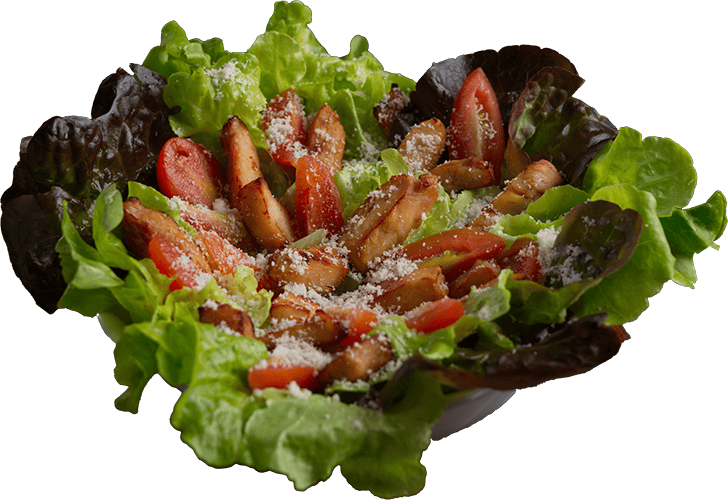 Gemischter Salat, Cherrytomaten, Hähnchenbruststrücke, Grana Padano.